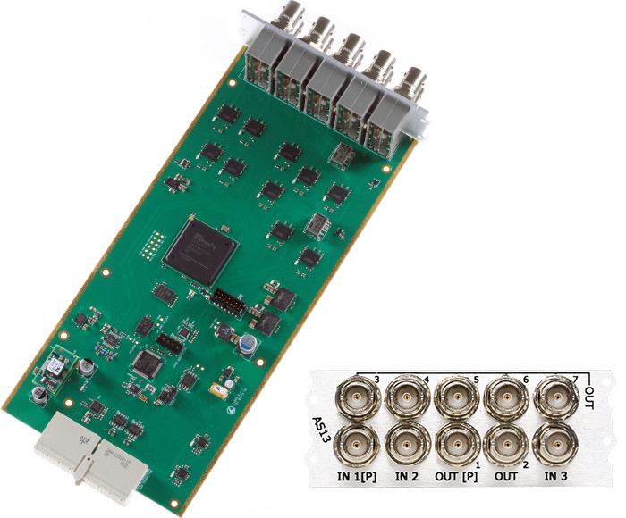 El AS13 es un switch ASI que ocupa 2 de los 6 slots disponibles; tiene 3 entradas y 7 salidas todas sobre BNC (75 OHM) conectores.