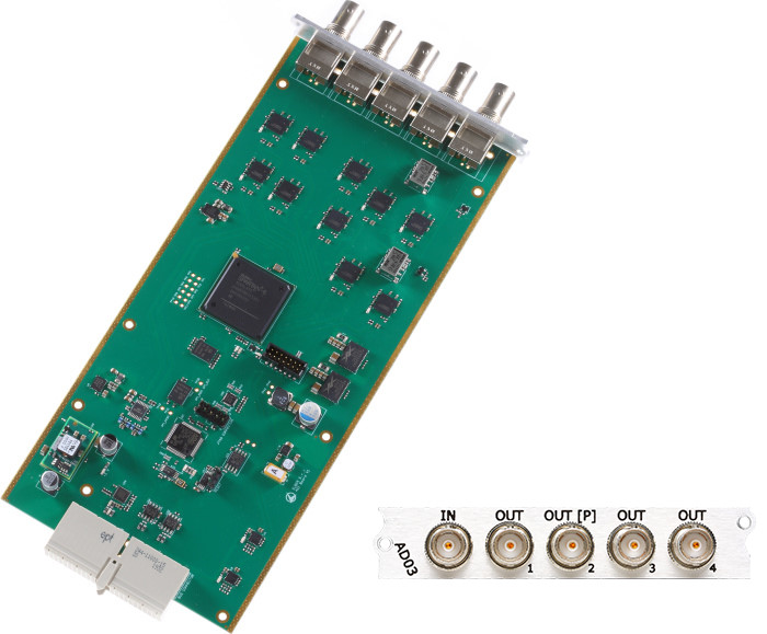 El AD03 es un distribuidor ASI con 1 entrada (BNC 75 Ohm) y 4 salidas ASI (BNC 75 Ohm) de las cuales una pass- through. Ocupa 1 slot.