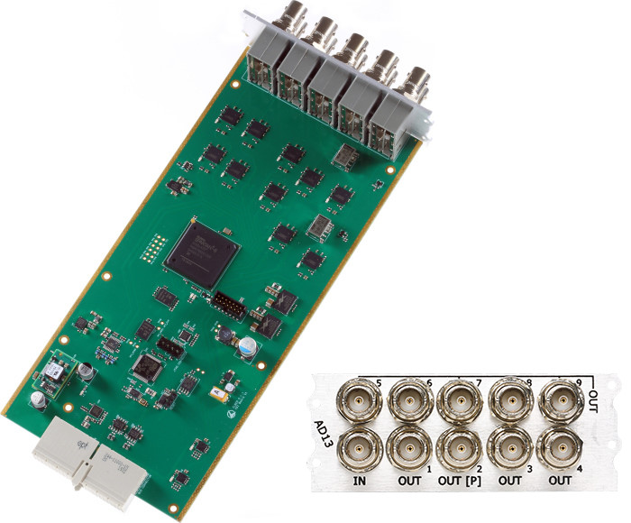 El AD13 es un distribuidor ASI con 1 entrada (BNC 75 Ohm) y 9 salidas ASI (BNC 75 Ohm) de las cuales una pass- through. Ocupa 2 slots.